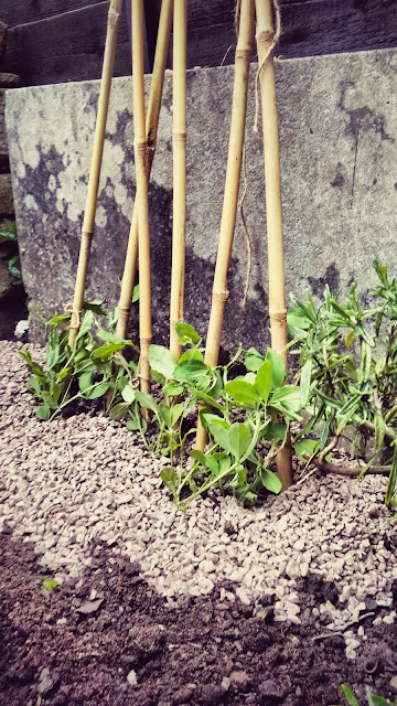Last weekend, I decided it was time to plant out some sweet peas I had been hardening off for a couple of weeks. I didn't have as much germination success as I had before, and I don't really have space to build another teepee. So I put together some bamboo canes I had lying about and made some sort of trellis contraption.I spotted a slug while I was tying everything together, so I decided to scatter some gravel to make it a little difficult for them to nom on my beautiful seedling.